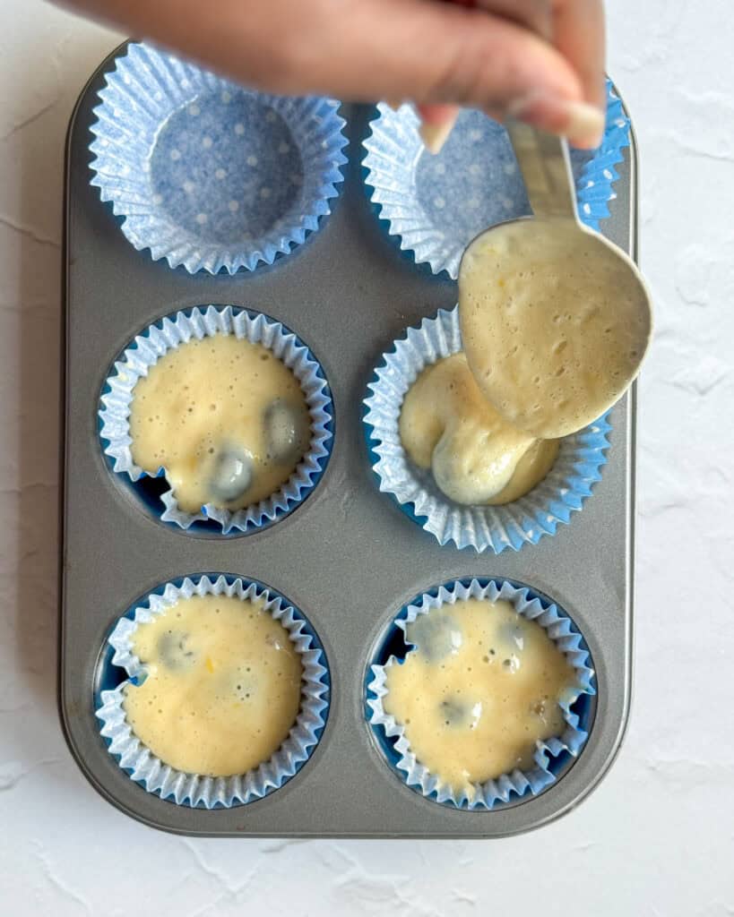 - Fold in the blueberries and divide the batter equally between the 6 muffin liners. Bake for 15-18 minutes or until a toothpick inserted into the middle comes out with a few crumbs.