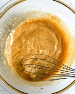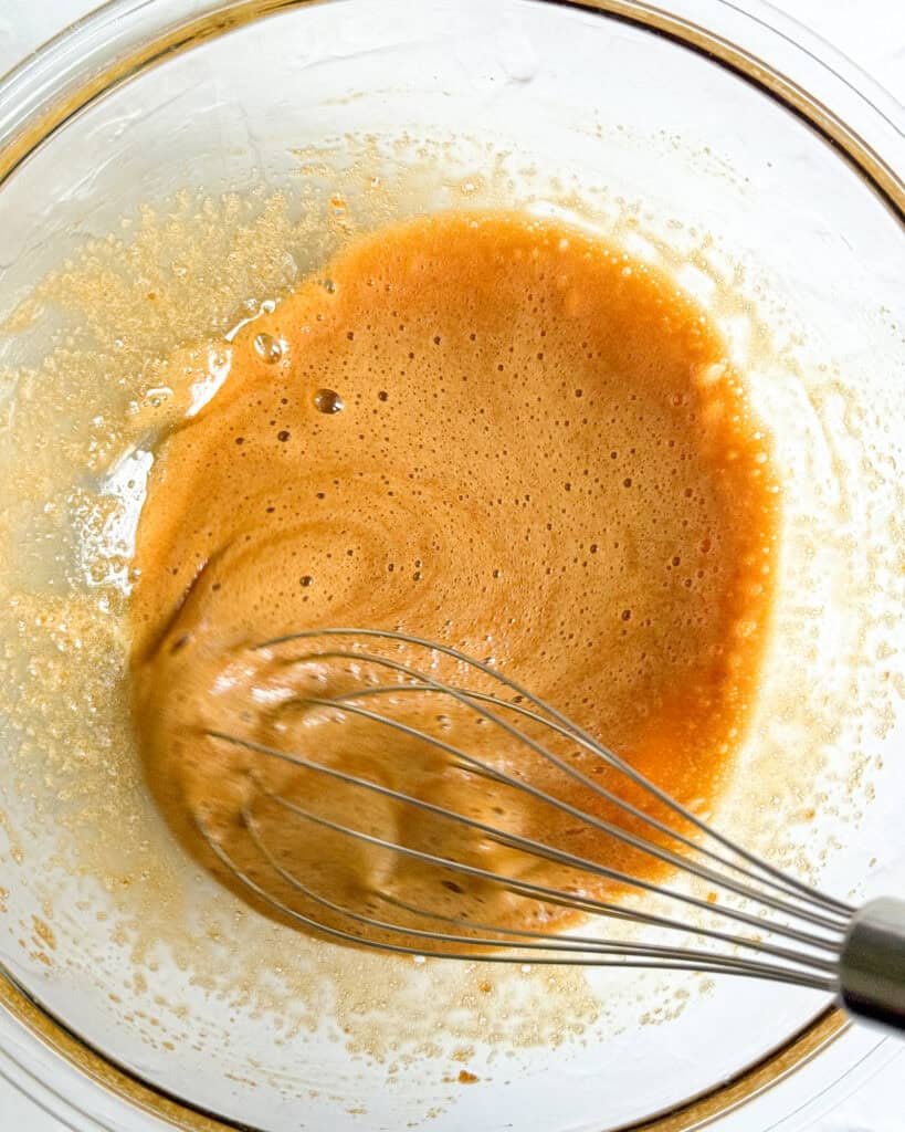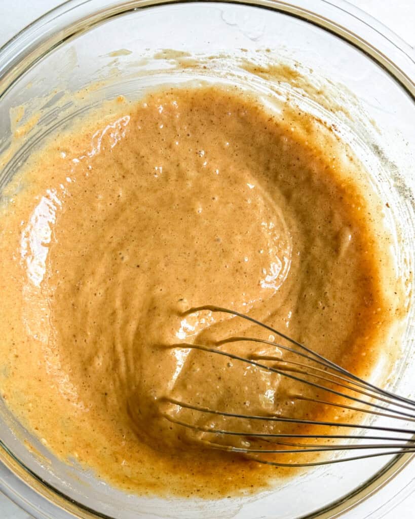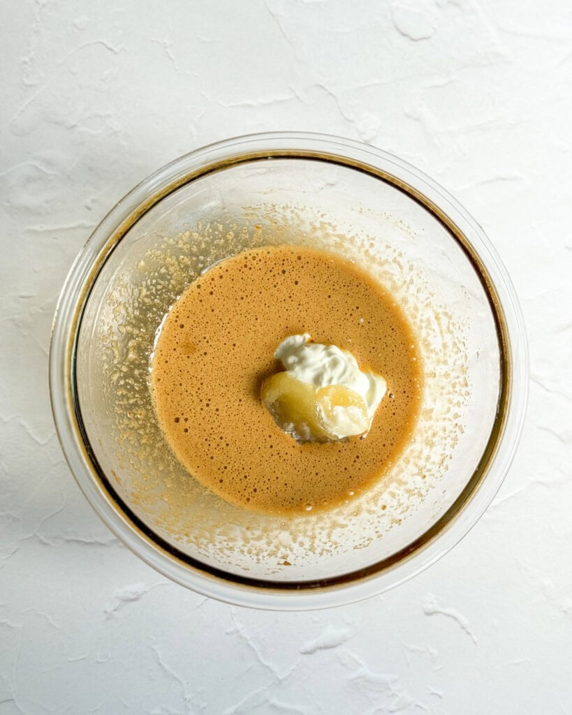 - To make the cake, whisk together the egg and 0 calorie brown sugar until light and fluffy. Add the yogurt, applesauce and vanilla extract and whisk until smooth.