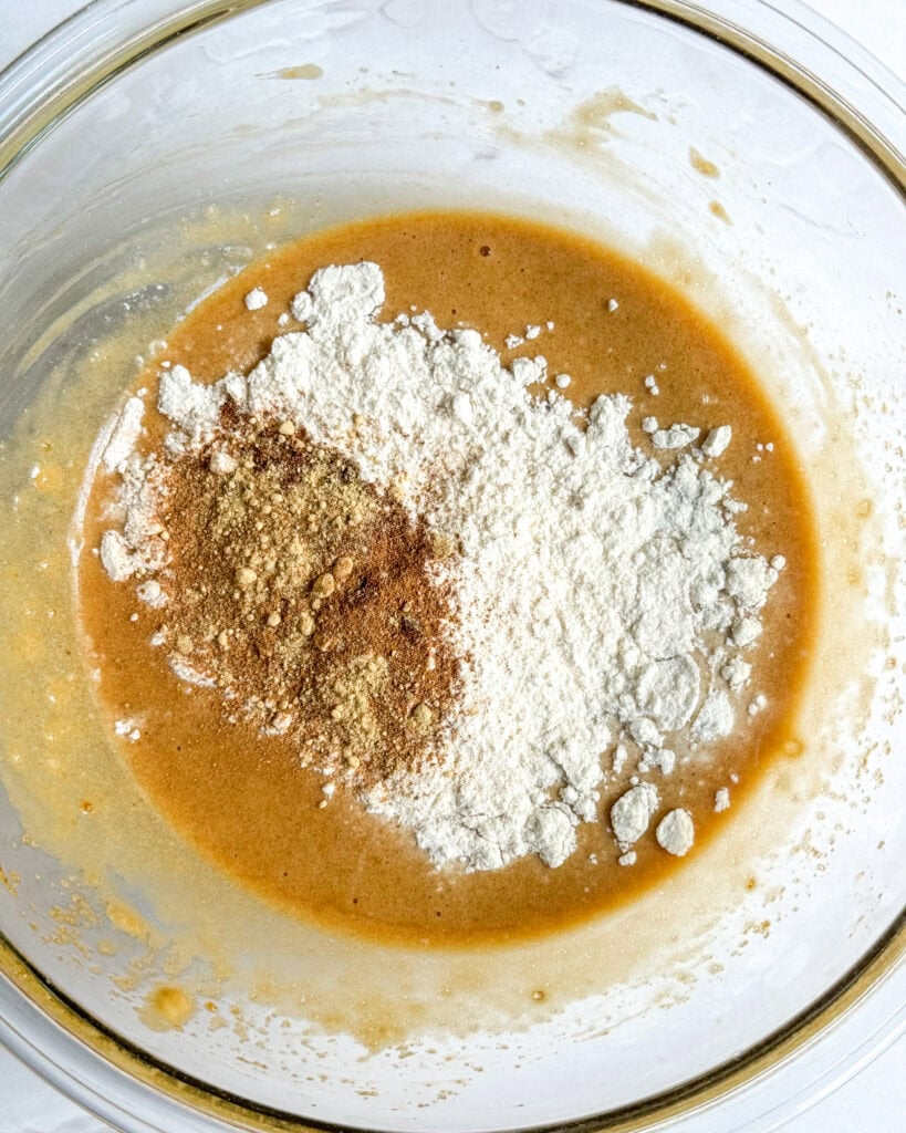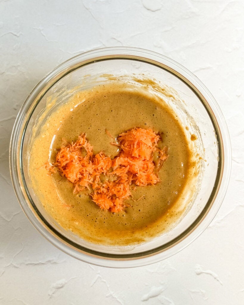 - Add the flour, spices, baking powder and shredded carrot and whisk to combine.