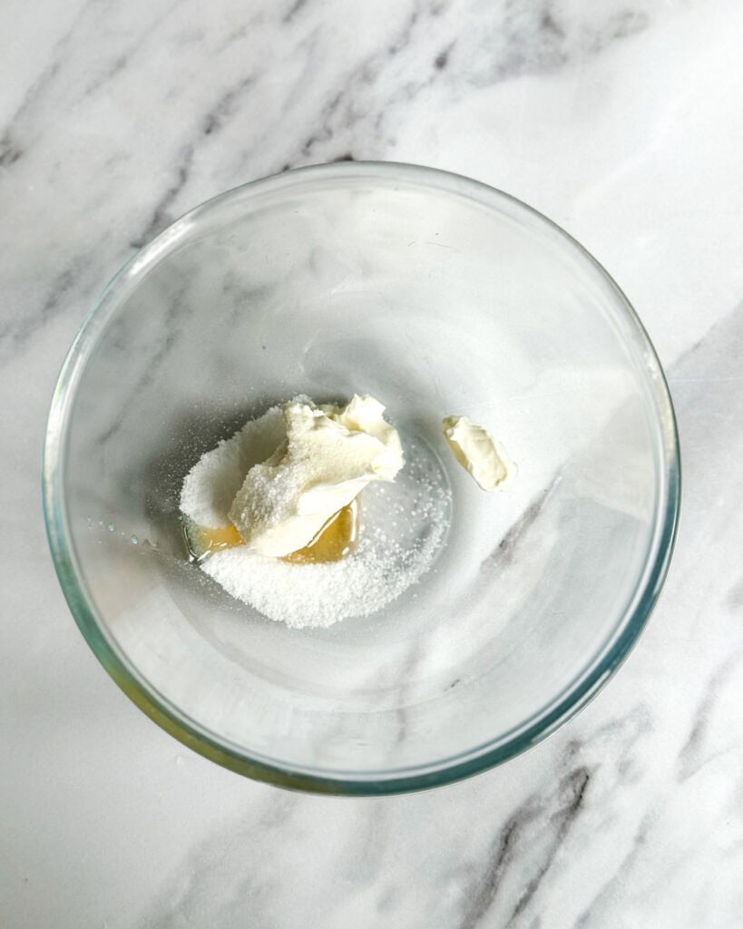 - To make the cheesecake filling, mix the cream cheese, lemon juice and stevia in a small bowl until smooth.
