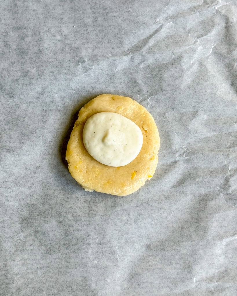 - Create 6 equal circular blobs of the cheesecake filling onto the parchment paper and place in the freezer for at least 1 hour to set.