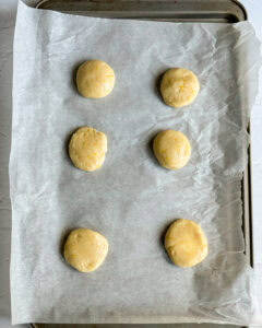 - Divide the dough equally between 6 cookie balls, flatten each dough ball between your palms and place a cheesecake disc in the middle and roll back into a ball.