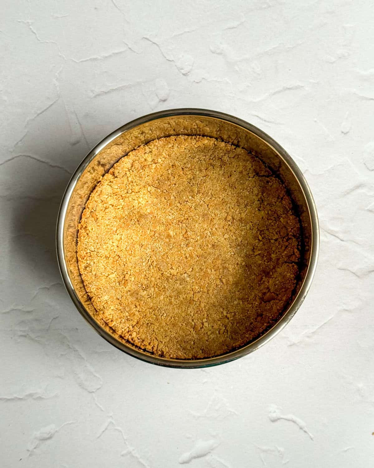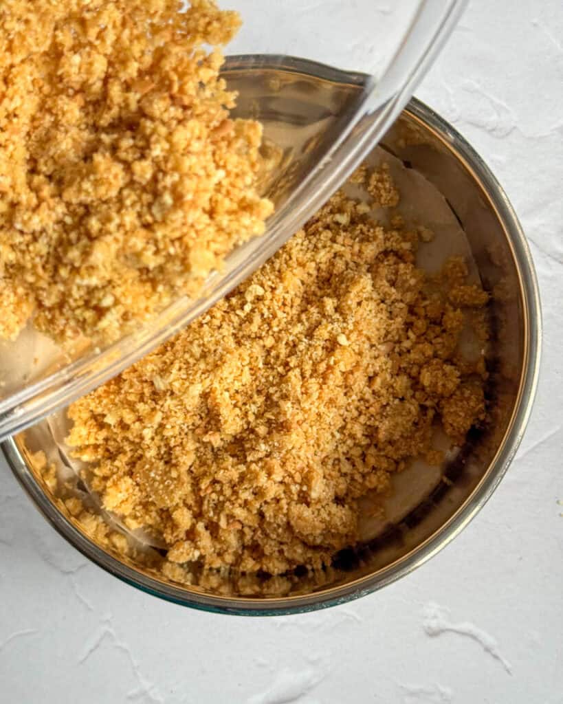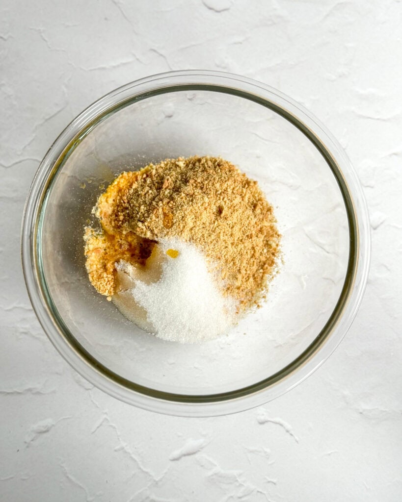 - In a medium bowl, crush the rich tea biscuits with a rolling pin until fine crumbs. You can also place them in a ziplock bag and crush that way. Add the melted butter and stevia into the biscuit/cookie crumbs and mix to combine.