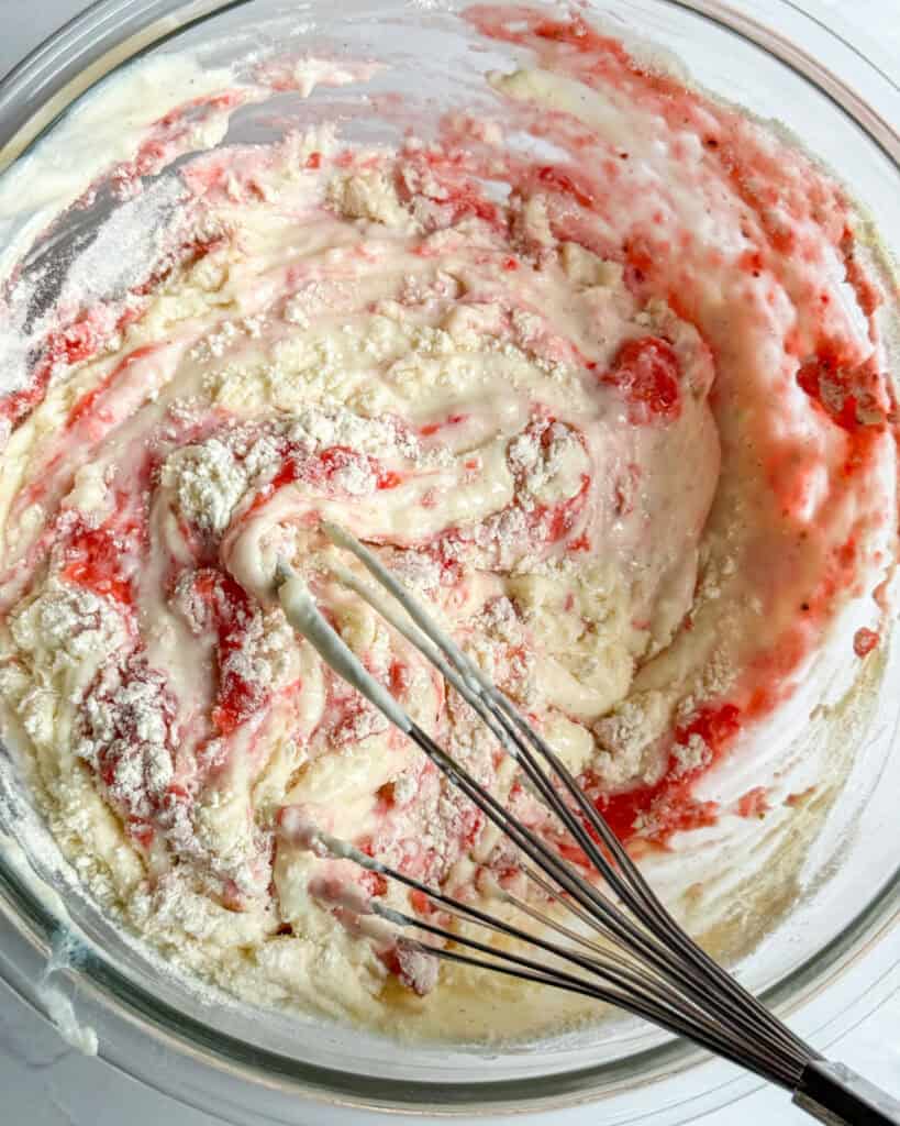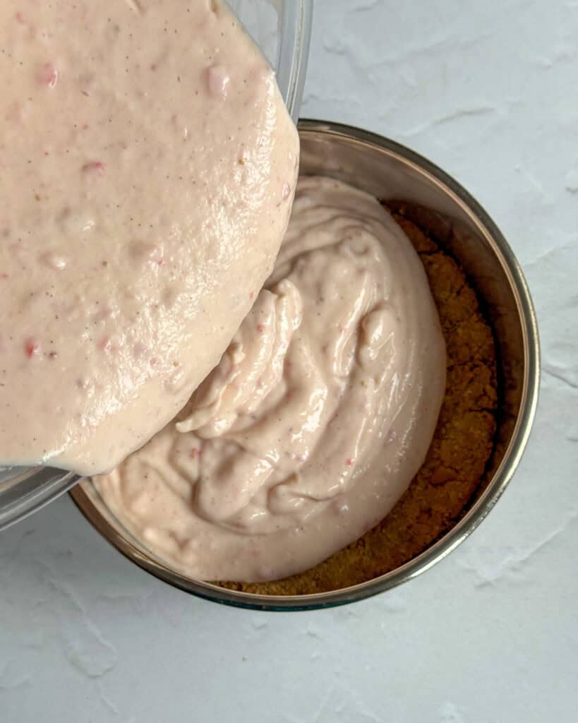 - Add half of the strawberry puree to the cheesecake mixture and fold to combine. Pour the cheesecake filling over the cookie base.