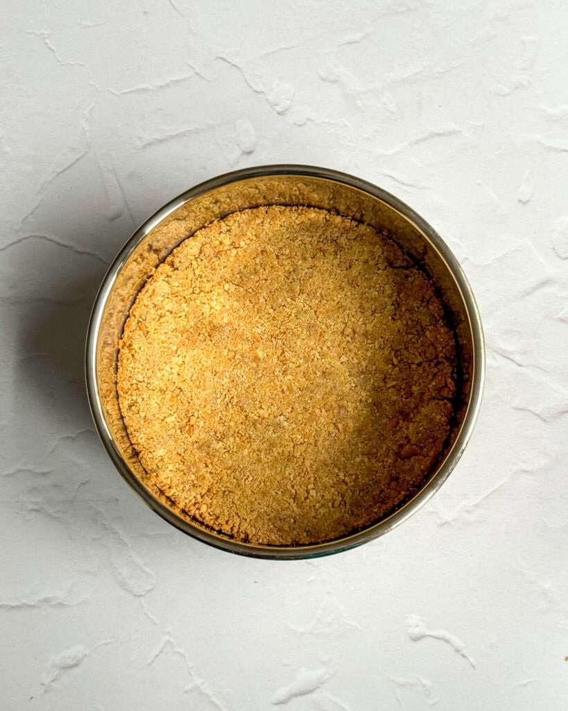 - Add the melted butter and stevia into the biscuit/cookie crumbs and mix to combine. Transfer to the lined cake tin and bake for 10 minutes. Set aside.