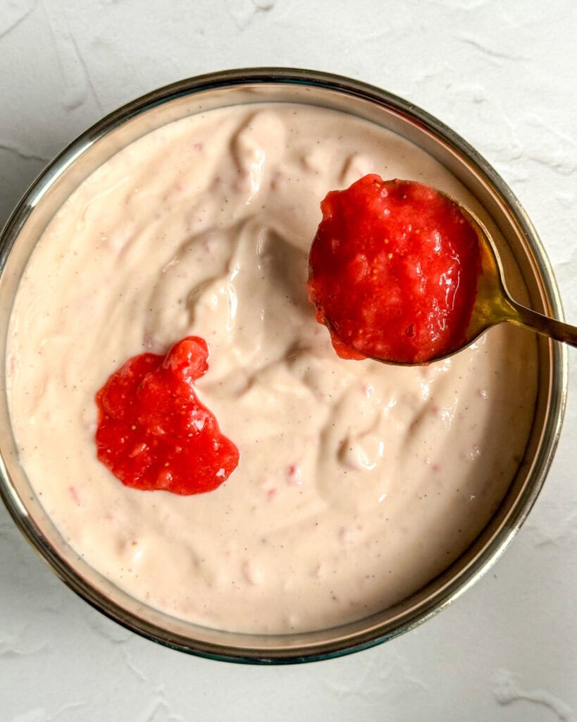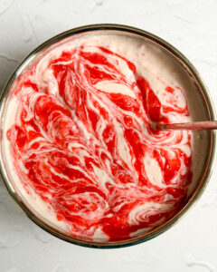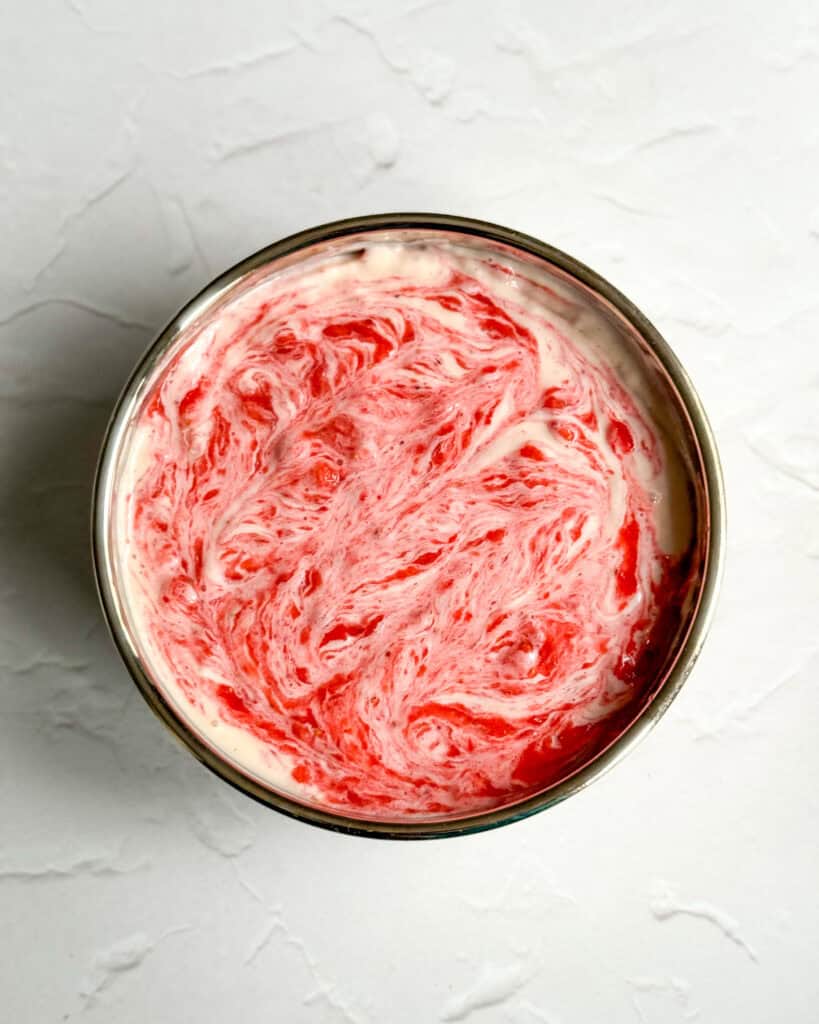 - Add half of the strawberry puree to the cheesecake mixture and fold to combine. Pour the cheesecake filling over the cookie base. Using a tablespoon, scoop blobs of the strawberry puree and place over the cheesecake filling until you’ve used up all the puree. Using a chopstick or a toothpick, create swirls by lightly mixing the puree into the cheesecake.