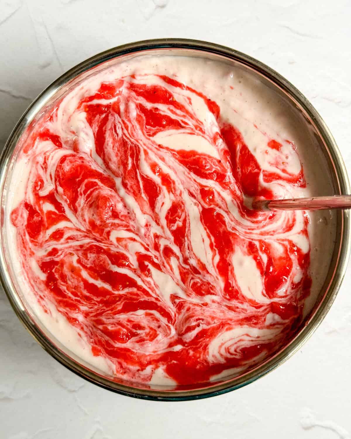 - Using a tablespoon, scoop blobs of the strawberry puree and place over the cheesecake filling until you've used up all the puree. Using a chopstick or a toothpick, create swirls by lightly mixing the puree into the cheesecake.